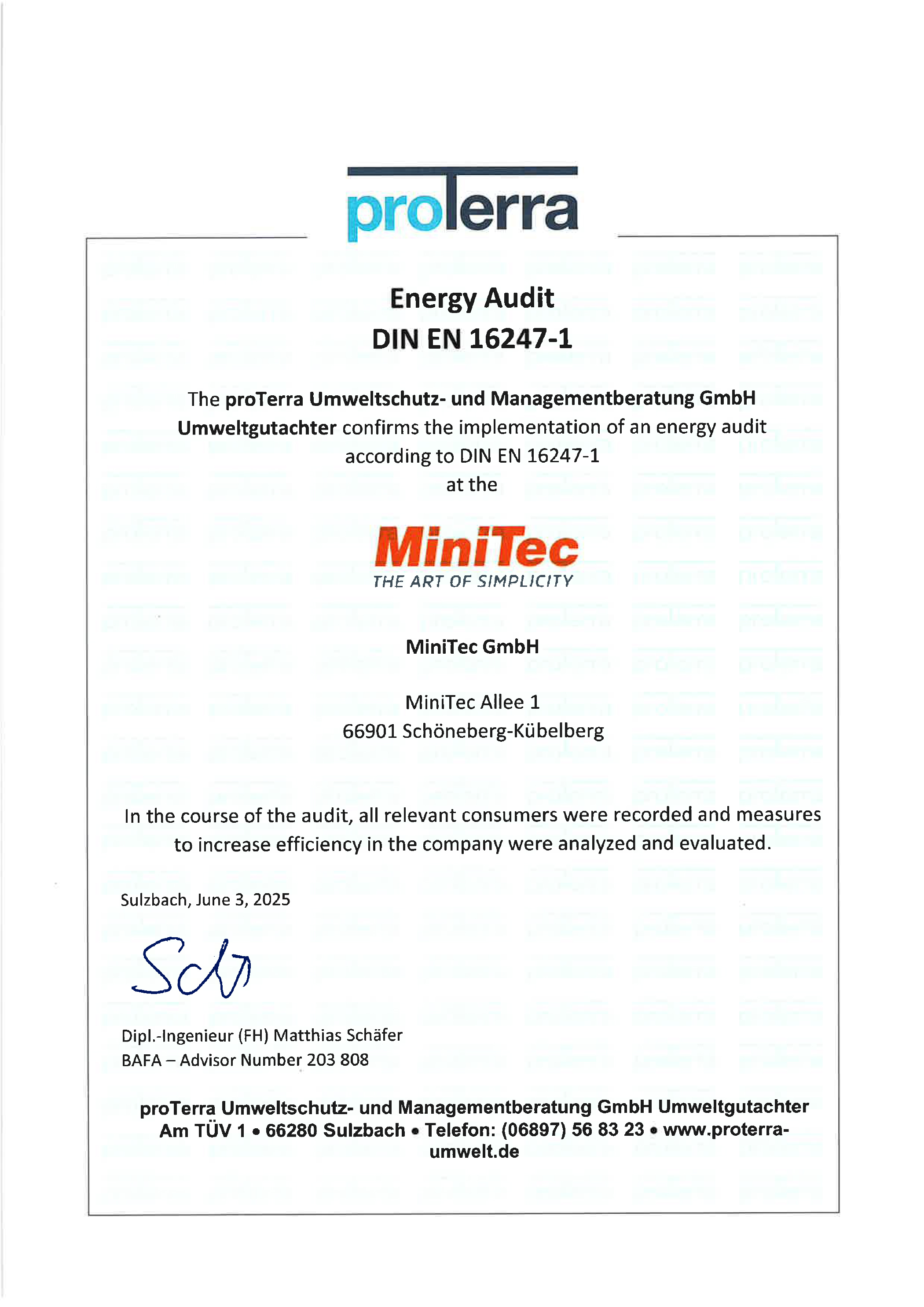 Careful use of resources and active environmental protection are principles of our corporate philosophy and part of our Corporate Principles and Code of Conduct. Sustainability is also a management task and is considered transparently in all business activities along the value chain at MiniTec. Within the scope of our implemented management systems according to ISO 14001 for environmental protection and DIN EN 16247-1 for energy management, sustainability becomes a central topic in product development but also within manufacturing and purchasing of products. We have addressed the issues that are essential for us and can be influenced in the management evaluation and are continuously improving them.